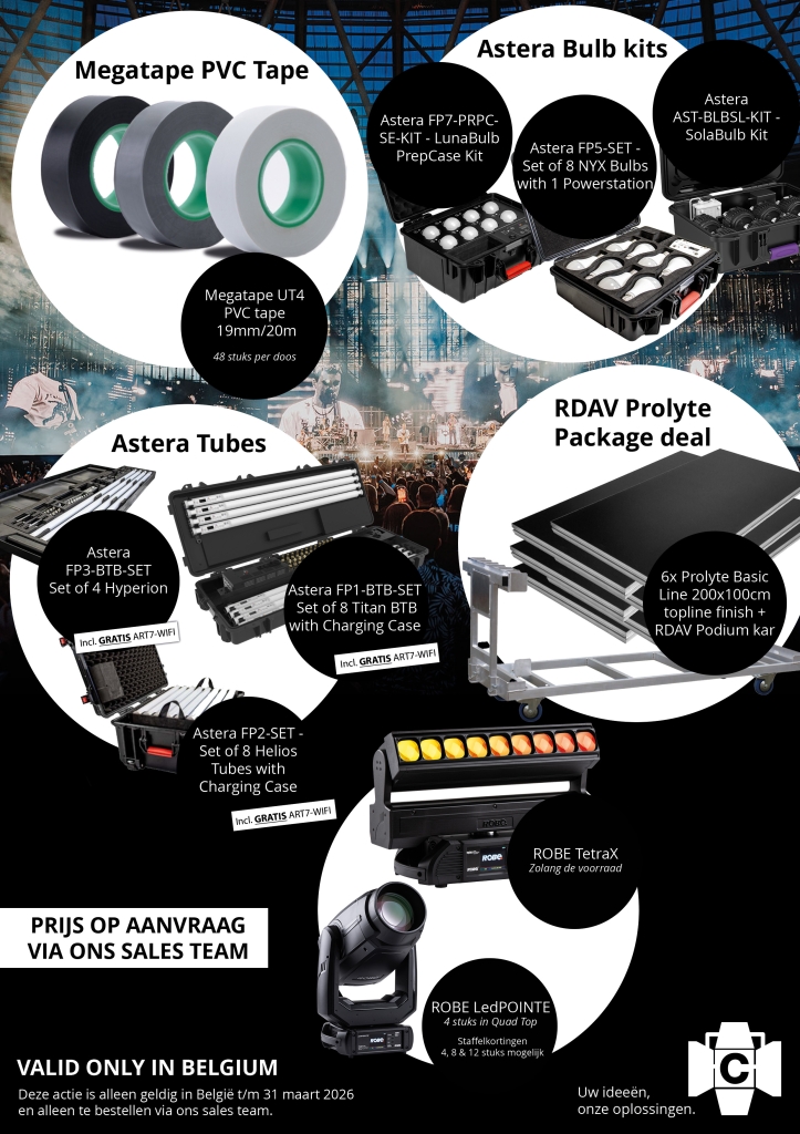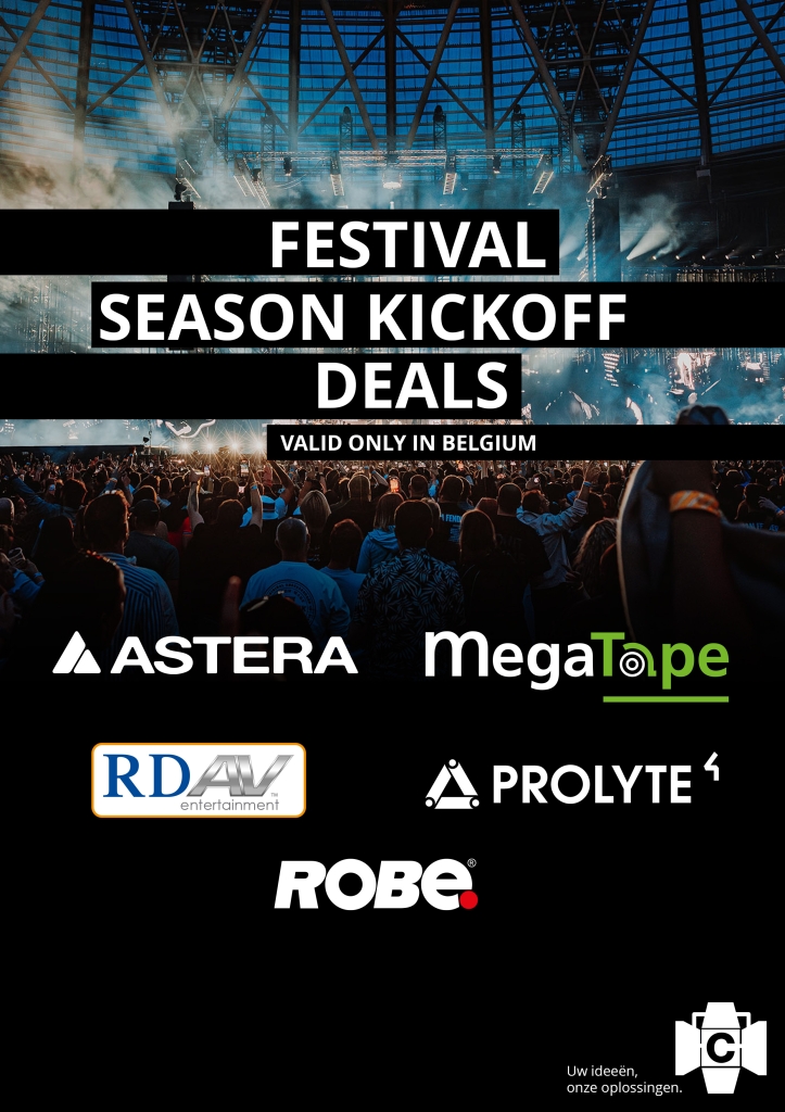 Het festivalseizoen komt eraan — zorg dat je voorbereid bent! Profiteer nu van tijdelijke kickoff deals op o.a. Megatape PVC Tape, Astera Tubes & Bulbs en RDAV Prolyte Package deal.