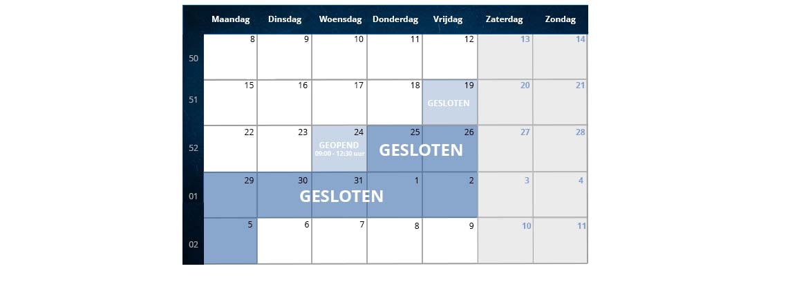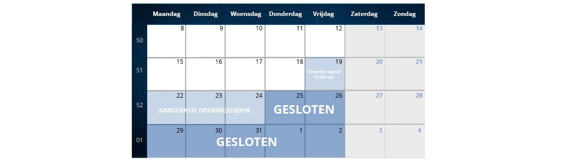 In verband met kerst, de jaarwisseling en onze jaarlijkse inventarisatie hanteren wij in week 51 en 52 aangepaste openingstijden.